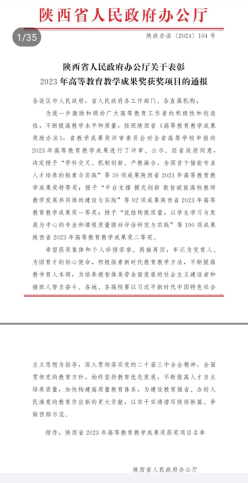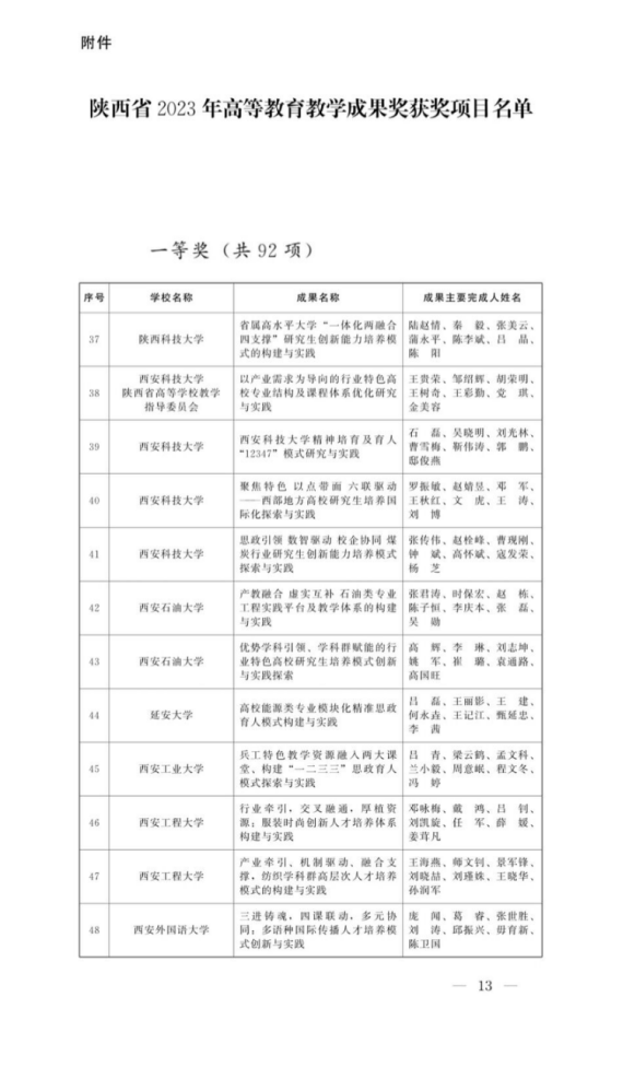 近日,陕西省2023年高等教育教学成果奖获奖项目公布,我院吕青教授团队申报的“兵工特色教学资源融入两大课堂、构建 “一二三三”思政育人模式探索与实践”项目获得陕西省2023年高等教育教学成果奖一等奖。