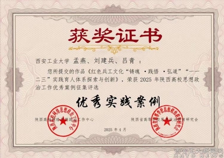 近日,由陕西高校网络思想政治工作中心、陕西省高等学校思想政治教育研究会联合开展的2025年陕西高校网络思想政治工作案例征集活动圆满落幕。我院孟燕老师牵头申报的《红色兵工文化“铸魂·践悟·弘道”“一一二三”实践育人体系探索与创新》被评为“优秀实践案例”。该案例以习近平新时代中国特色社会主义思想为引领,以培育新时代具备兵工品格的青年马克思主义者为目标,深挖红色兵工革命精神,以“中国的保尔·柯察金”吴运铎、“工人发明家”倪志福、新时代“最美铁路人”单杏花等红色兵工英模、先进人物为榜样,将思政小课堂和社会大课堂联动同行,构建了“红色兵工文化育人大课堂”,实现思政育人文化创新、思政实践教学创新的红色兵工文化创新实践育人体系。