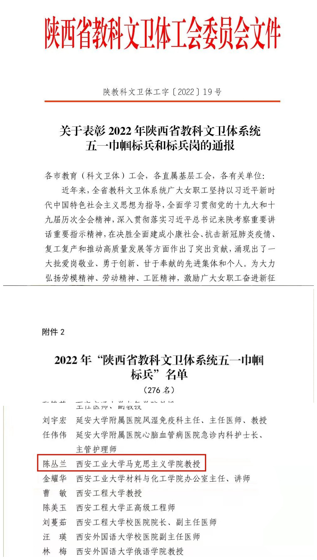 20222月,陕西省教科文卫体工会印发《关于推荐评选2022年“陕西省教科文卫体系统五一巾帼标兵(岗)”的通知》,经过院校推选、省教科文卫体工会委员会评审,我院陈丛兰教授获得“2022 年陕西省教科文卫体系统五一巾帼标兵”荣誉称号。