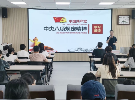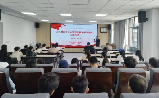 梁华平院长围绕中央八项规定的背景、主要内容、政策图解、数字解读、关键词等五个方面,详细解读了中央八项规定的核心内容与精神实质。他结合学校相关工作要求及个人学习体会,系统梳理并总结了党的十八大以来作风建设的显著成效与宝贵经验。