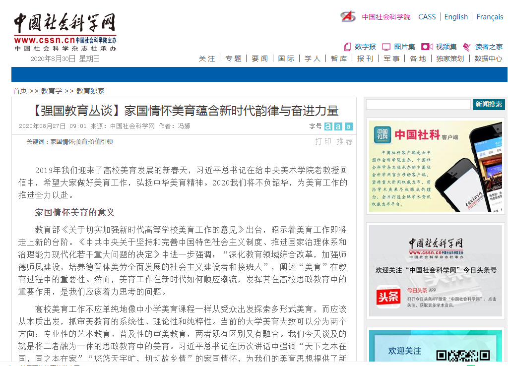 我院冯婷博士文章《家国情怀美育蕴含新时代韵律与奋进力量》2020年08月27日在中国社会科学网和学习强国平台发表。