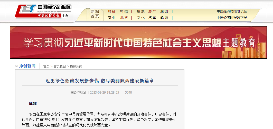 我院2020级研究生解娜撰写的论文《迈出绿色低碳发展新步伐 谱写美丽陕西建设新篇章》于2023年3月29日在《中国经济时报》理论版发表。该报纸是由国务院发展研究中心主办,主要探讨国民经济和社会发展中的全局性、综合性、战略性和长期性问题,通过刊载权威专家的理论研究与实践探索成果,分析当前经济社会的重点、热点、难点问题,向国务院即中央政府提供决策建议。