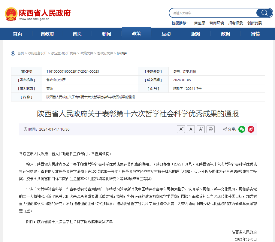近日,陕西省人民政府发布《关于表彰第十六次哲学社会科学优秀成果的通报》(陕政字【2024】7号),校党委宣传部副部长、我院导师冯婷副教授为第一完成人的智库报告荣获二等奖。