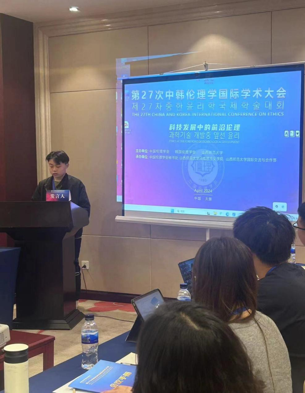 4月20日,由中国伦理学会、韩国伦理学会、山西师范大学共同主办的“第27次中韩伦理学国际学术大会”在山西省太原市顺利召开,我院研究生张湜钒应邀参加会议。