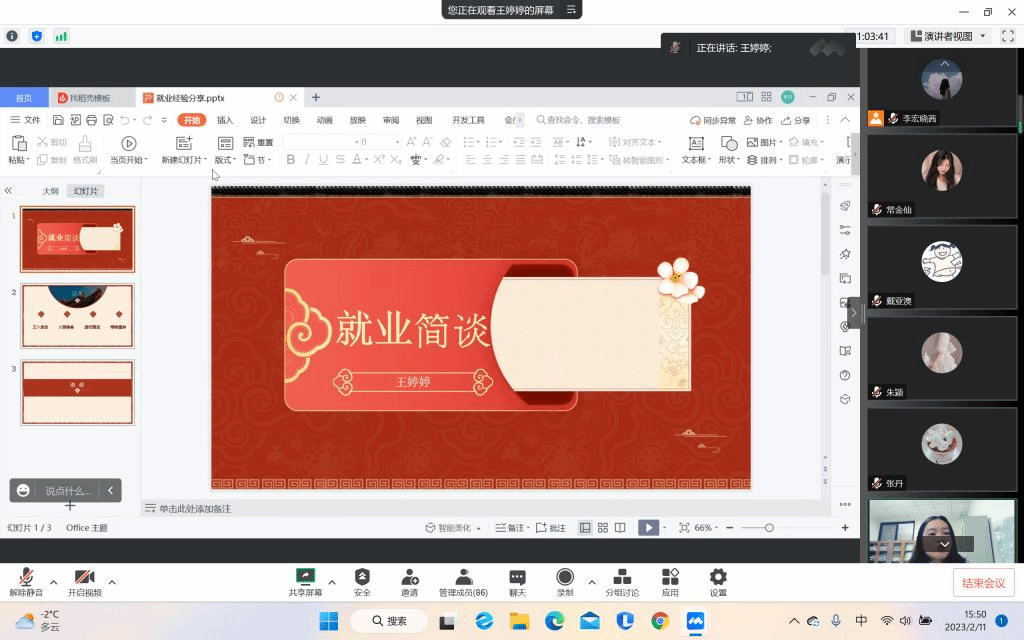 2023年2月11日下午,永利集团304开展寒假就业分享会。本次会议通过腾讯会议平台线上开展,学院党委副书记李明芳、辅导员王亚茹以及我院全体研究生参与。本次会议由我院学生会主席李宏晓茜主持,本次会议邀请到三位曾就读于我院的优秀硕士毕业生张鑫、张丹、王婷婷,为同学们进行了就业指导和相关经验分享。