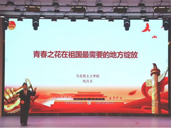 我院2021级研究生团支部副书记巩月月在以“青春之花在祖国最需要的地方绽放”为主题参赛,她讲出了新时代青年的心声:“年轻一代要继承和发扬吃苦耐劳、自力更生、艰苦奋斗的精神,摒弃骄娇二气,像我们的父辈一样把青春热血镌刻在历史的丰碑上。”“到祖国最需要的地方去,是伟大时代之需,是青年成长之要,是优良传统之继。奔赴光荣与梦想的远征,新时代青年更须在青春的赛道上奋力奔跑,用青春的能动力和创造力激荡起民族复兴的澎湃春潮,用青春的智慧和汗水打拼出一个更加美好的中国!”