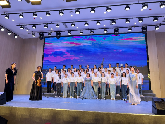 我院合唱队由来自研一、研二的35位同学与学院10名老师组成,以《东方之珠——军港之夜》串烧的方式演绎香港回归水兵归家的故事。沈华同学担任总策划与串讲人,杨崇同学重新整合编曲,李欣然同学进行小提琴演奏,李宏晓茜同学伴舞,与合唱团的其他成员一起,为观众们带来了一场视听盛宴。