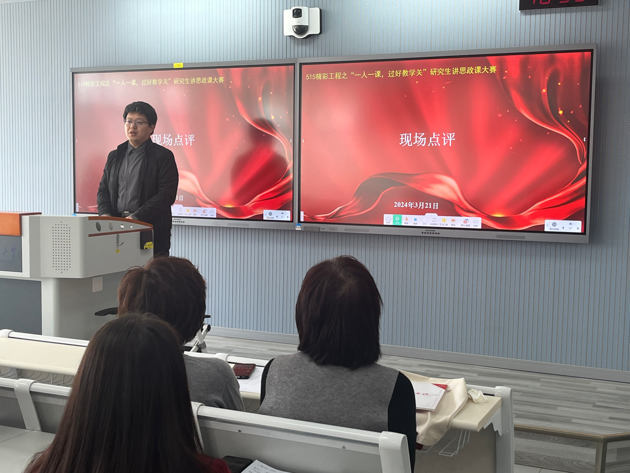 在点评环节,周意岷和沈华肯定了参赛选手的时代自信、青春自信和理论自信,并就选题和课件制作方面等提出建议,鼓励参赛选手进一步聚焦主题,注意课堂用语和眼神互动,对知识点和教材体系要有更透彻的把握。
